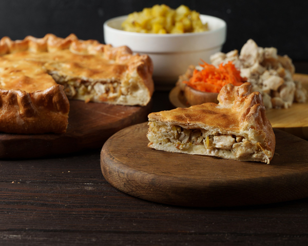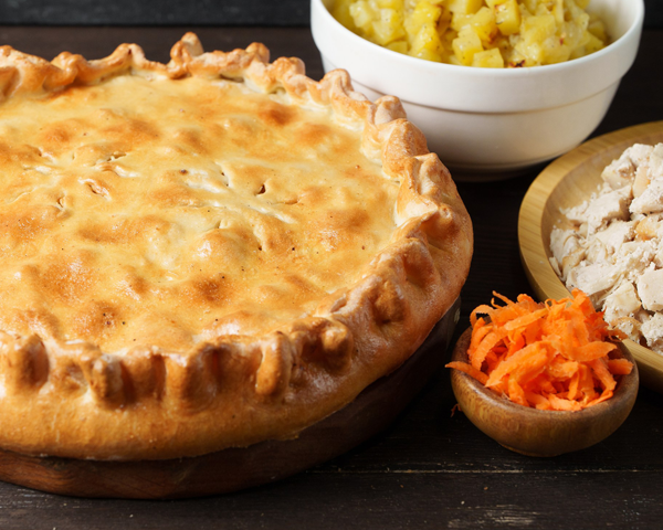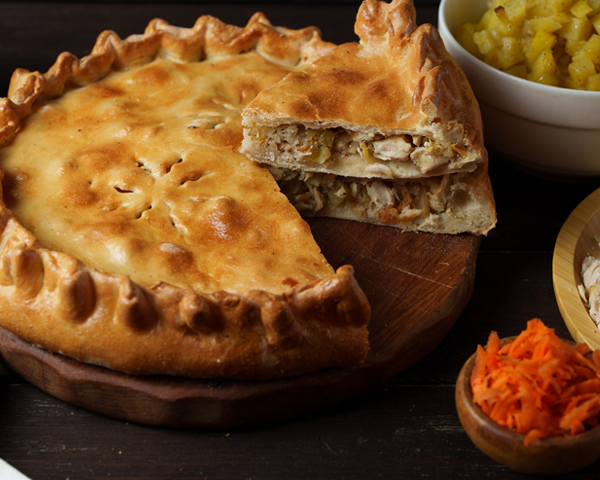 Мука пшеничная, вода, дрожжи, масло растительное, масло сливочное, курица, лук репчатый, картофель, морковь, перец, соль.